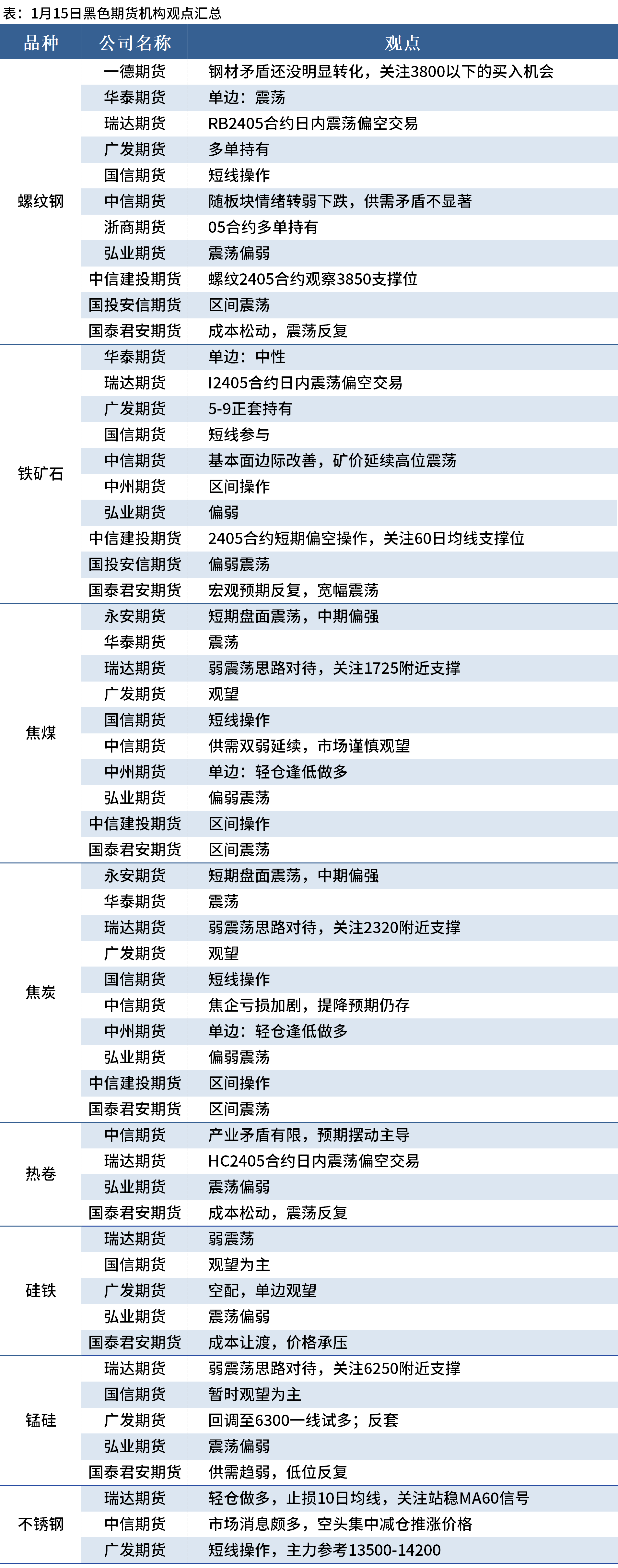 據(jù)Mysteel統(tǒng)計(jì)1月15日12家期貨機(jī)構(gòu)操作策略,其中多數(shù)機(jī)構(gòu)料螺紋鋼震蕩運(yùn)行,鐵礦石震蕩偏弱,焦煤、焦炭震蕩運(yùn)行。具體匯總內(nèi)容如下: