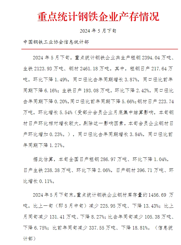 據(jù)中鋼協(xié)數(shù)據(jù)顯示,2024年5月下旬,重點(diǎn)統(tǒng)計(jì)鋼鐵企業(yè)粗鋼日產(chǎn)217.64萬(wàn)噸,環(huán)比下降1.49%,同口徑比去年同期增長(zhǎng)3.87%,同口徑比前年同期下降6.16%。5月下旬末,重點(diǎn)統(tǒng)計(jì)鋼鐵企業(yè)鋼材庫(kù)存量約1456.69萬(wàn)噸,比上一旬(即5月中旬)減少225.95萬(wàn)噸、下降13.43%;比上月同旬減少131.41萬(wàn)噸、下降8.27%。