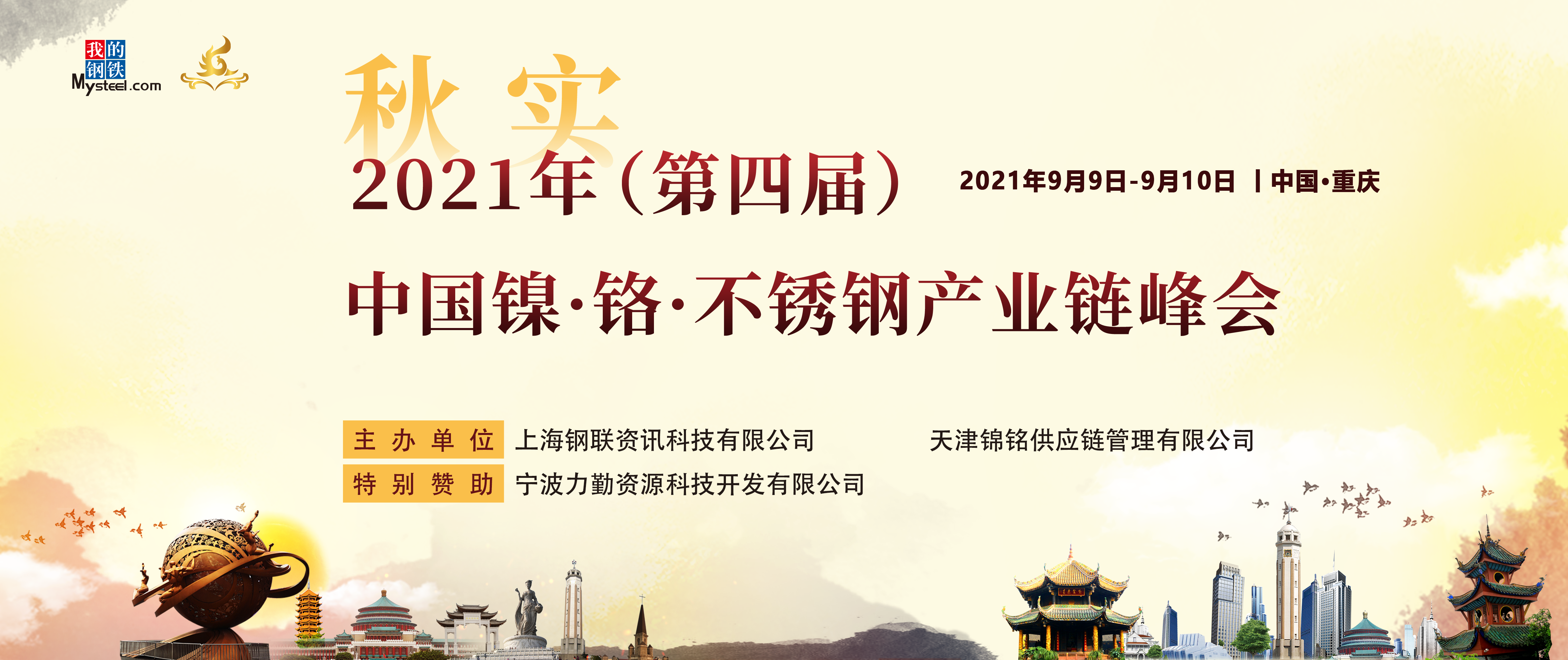 2021年9月9日-9月10日,由上海鋼聯(lián)資訊科技有限公司(Mysteel我的不銹鋼網(wǎng))攜手天津錦銘供應(yīng)鏈管理有限公司聯(lián)合主辦,寧波力勤資源科技開發(fā)有限公司特別贊助的“「秋實(shí)」2021年(第四屆)中國鎳·鉻·不銹鋼產(chǎn)業(yè)鏈峰會(huì)”,于重慶喜來登大酒店盛大開幕。